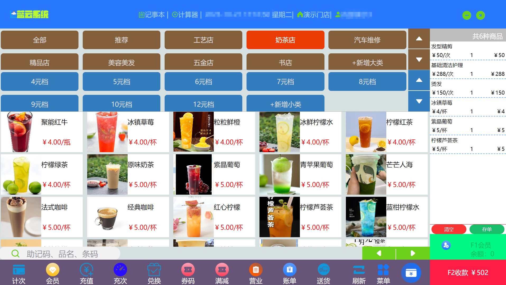 计费收银,计次收银,储值卡结账,微信支付宝现金结算;打印结账单,商品单,抹零,优惠券使用;员工提成,全单比例折扣,操作简单便捷;